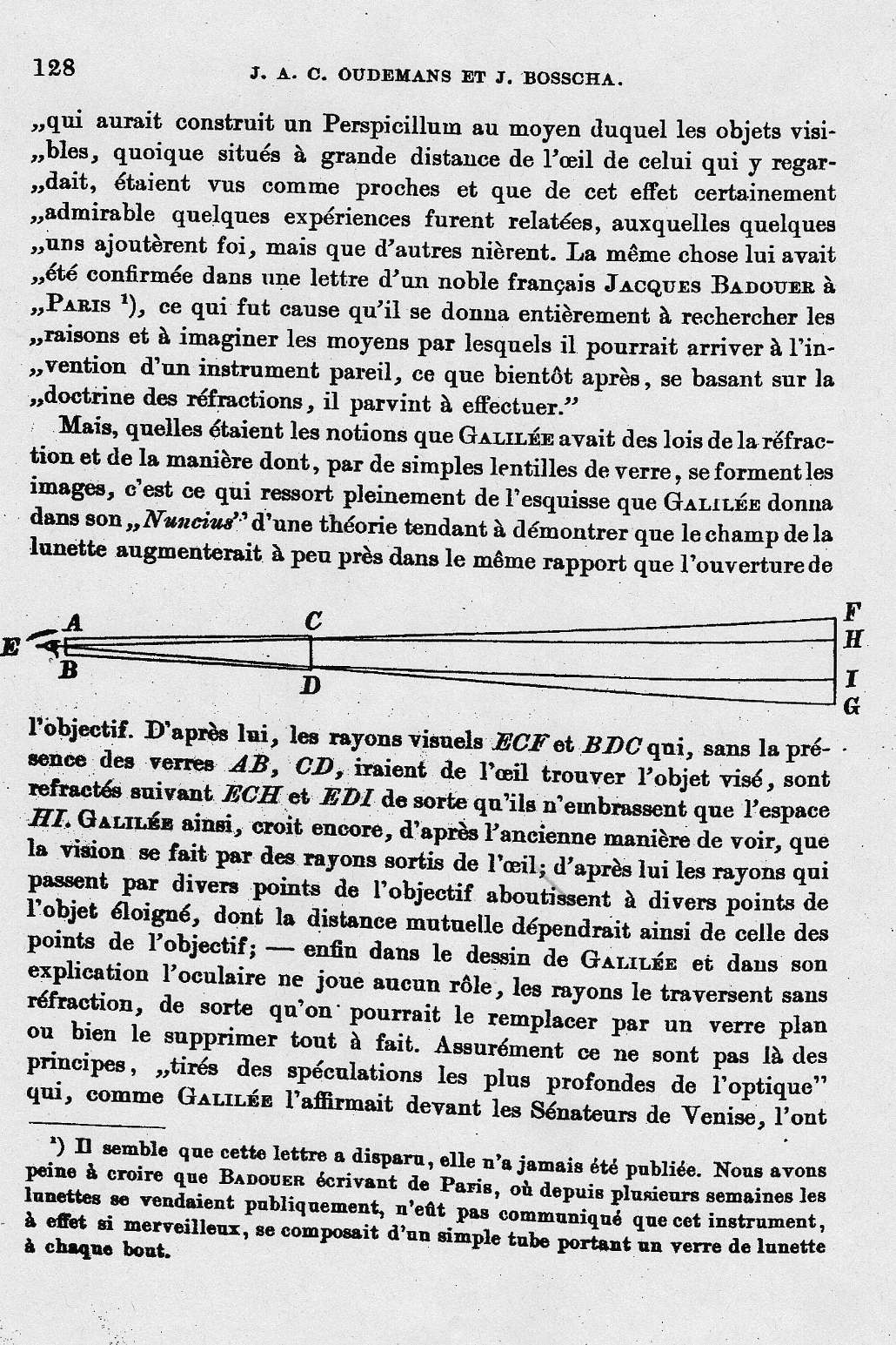 Doch welche Kenntnisse Galilei über die Brechungsgesetze benötigte und über die Art und Weise, wie mittels einfacher Glaslinsen Abbilder erzeugt werden, geht voll und ganz aus der Skizze hervor, die Galilei seinem Sternenboten einfügte[2] und mit deren Hilfe bewiesen werden sollte, dass das Blickfeld eines Fernrohrs ungefähr im gleichen Verhältnis zunimmt, wie die Öffnung des Objektivs. Solange in dem Rohr keine Linsen wären, würden die Sehstrahlen zum Gegenstand FG entlang den geraden Linien ECF, EDG laufen. Bei eingefügten Linsen aber mögen sie entlang den gebrochenen Linien ECH, EDI laufen; sie werden nämlich gesammelt, und dieselben, die sich vorher ungehindert auf den Gegenstand FG richteten, werden nur noch den Teil HI umfassen.[3] Galilei glaubt also immer noch an die alte Sichtweise, dass das Bild durch vom Auge ausgehende Strahlen erzeugt wird; demnach führen die Strahlen, die verschiedene Punkte des Objektivs passieren, zu verschiedenen Punkten des entfernten Objekts, deren gegenseitiger Abstand denen des Objektivs entspricht; - schließlich spielt in Galileis Zeichnung und in seiner Erklärung das Okular keine Rolle, die Strahlen passieren es ohne Brechung, von der Art, dass man es durch ein planes Glas ersetzen oder es gleich ganz weglassen könnte. Sicher sind das nicht Grundsätze, die, "im Ergebnis überaus verwickelter Berechnungen der Perspektive entstanden" sind, die, wie Galilei vor den Senatoren von Venedig bekräftigte, ...